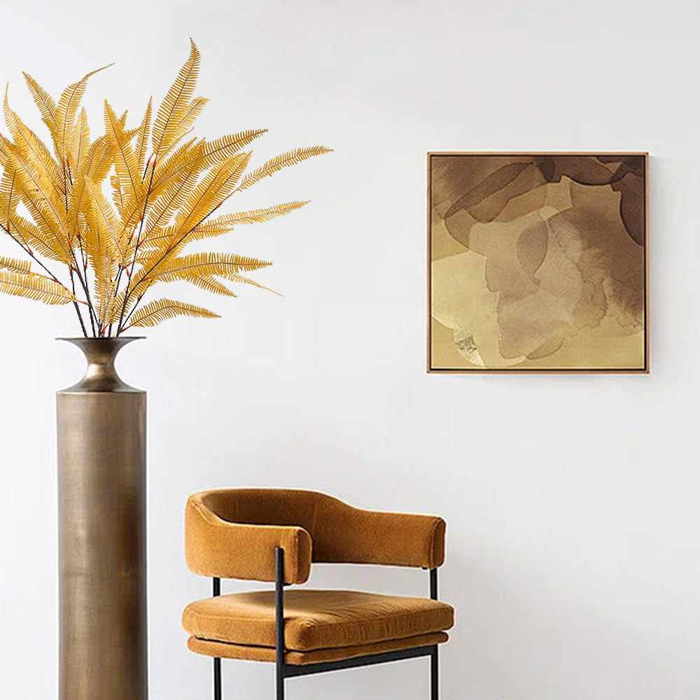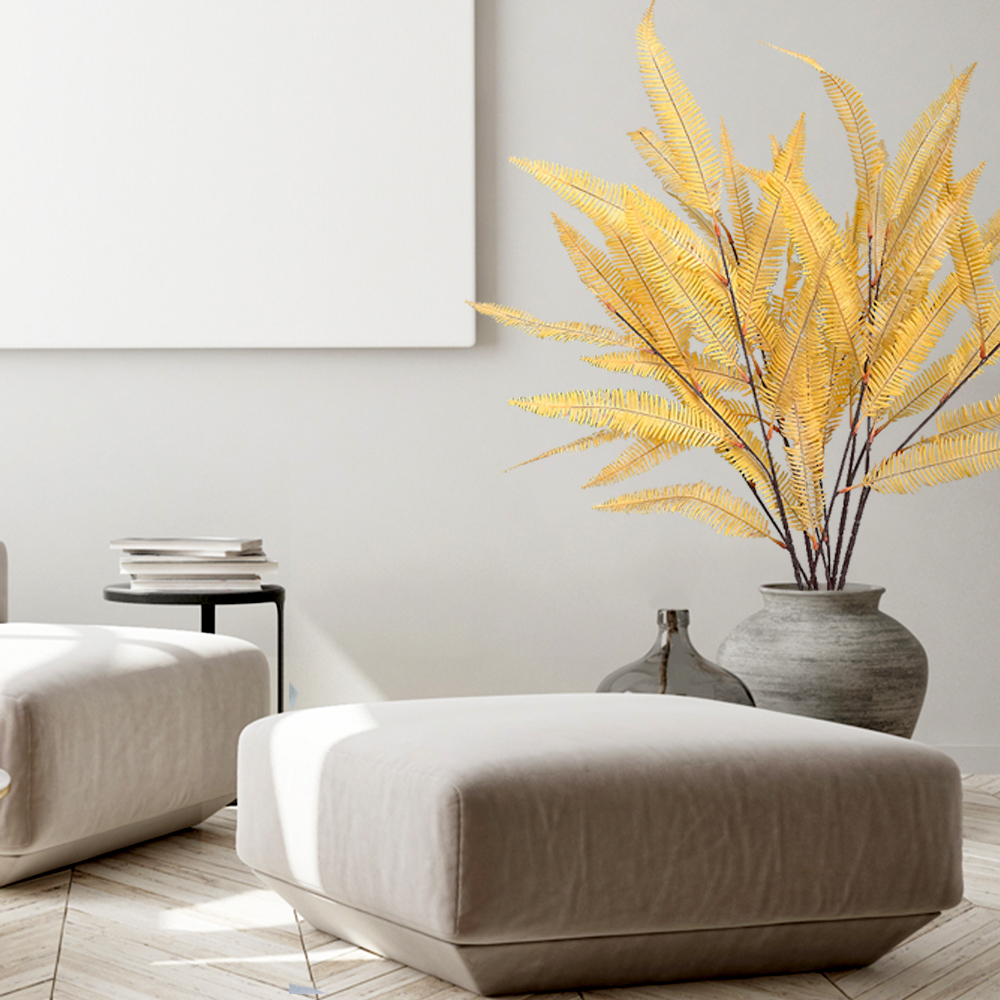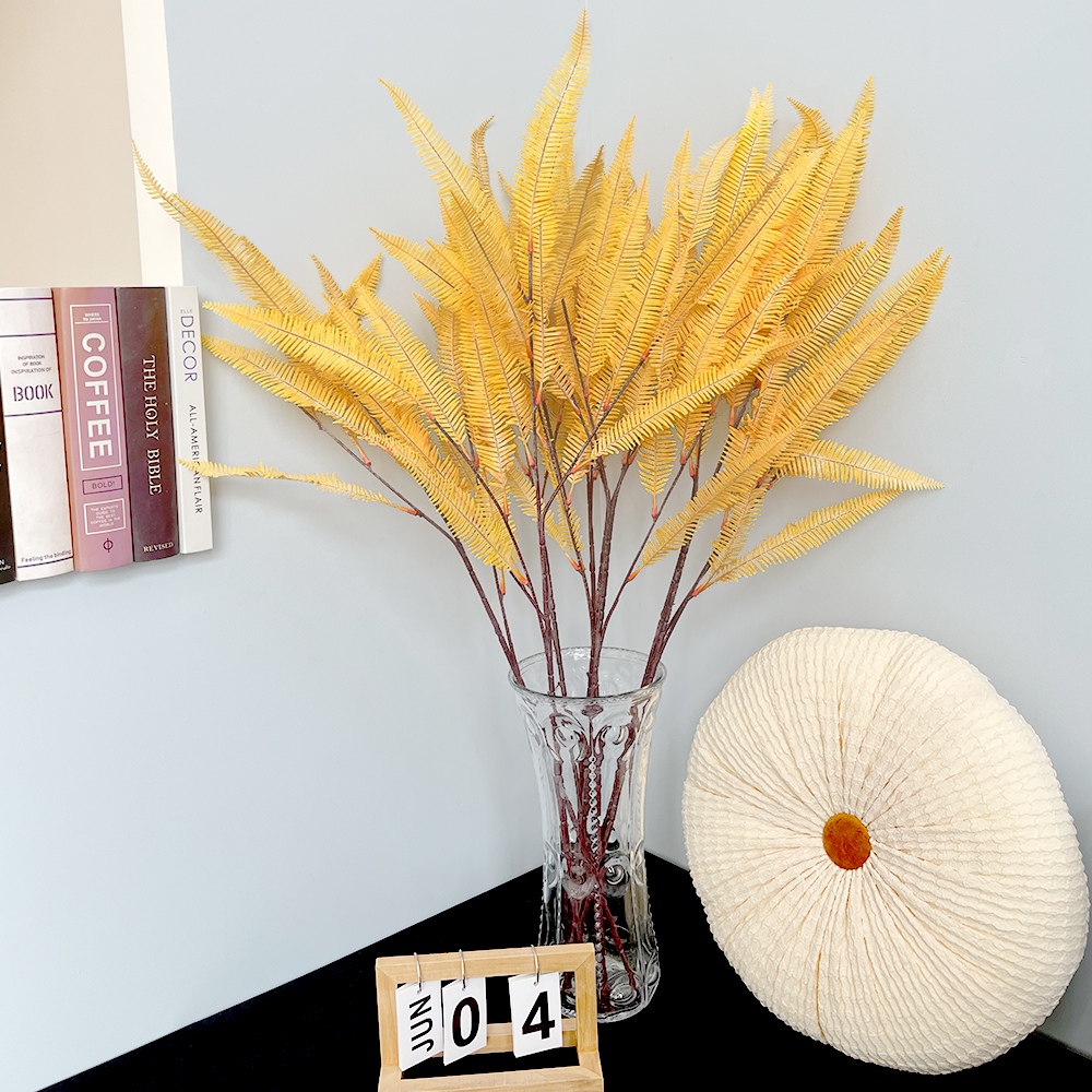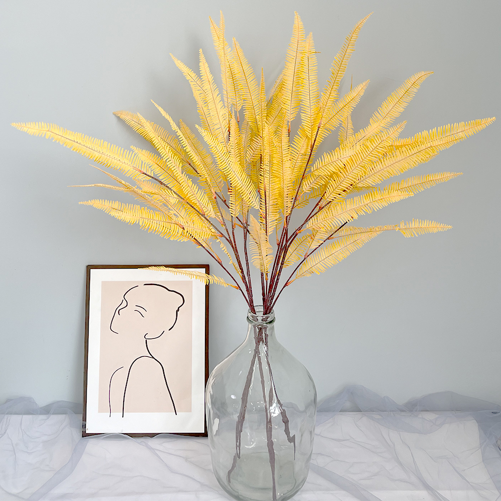 Artificial fern, yellow feathered plants, green plants decorated at home in the wedding center.