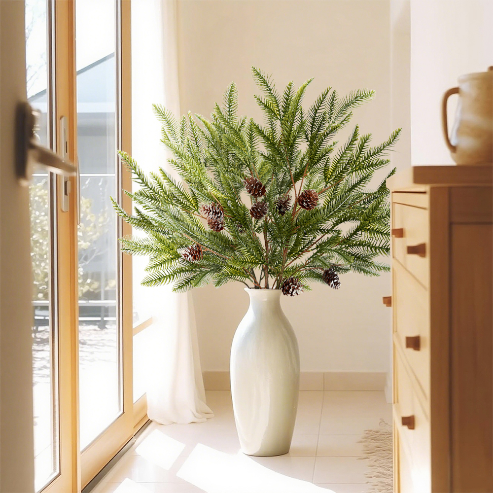 Christmas Artificial Pine Needles Branch with Pinecones Stems Fake Greenery Tree Branch for White Winter Decor